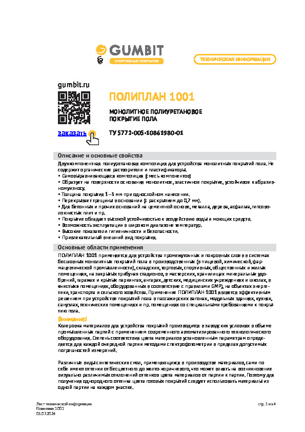 Самовыравнивающаяся полиуретановая композиция. Предназначена для устройства дезактивируемых монолитных напольных покрытий на объектах атомной энергетики.